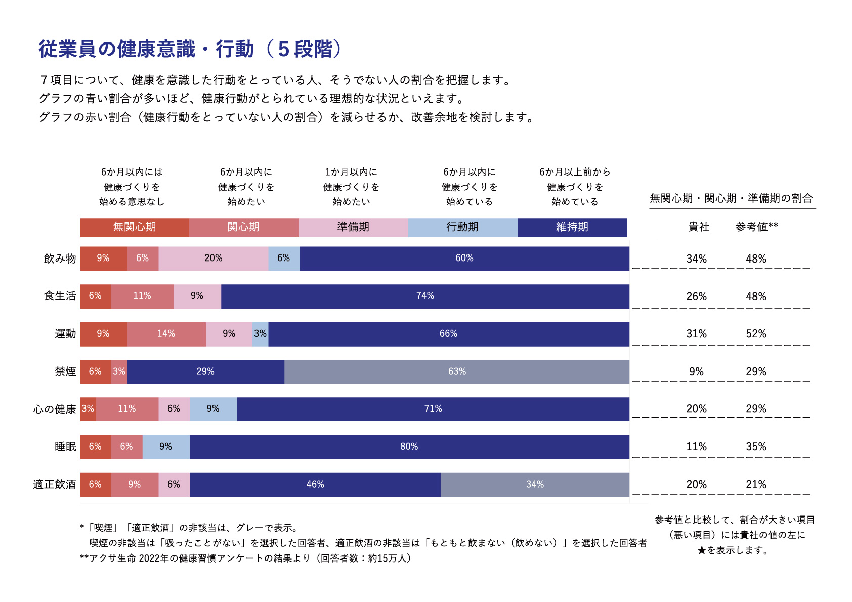 このアンケートでは、7項目の生活習慣を5段階の行動変容で「見える化」しています。
